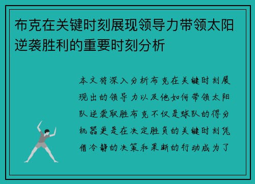 德文·布克(Devin Booker)是当代NBA最具潜力与天赋的得分后卫之一,自从进入NBA以来,他的职业生涯经历了快速的成长与蜕变。从一个新秀到成为联盟顶级的超级巨星,布克的路充满了挑战与机遇。本文将详细回顾布克职业生涯中的关键转折点与成就,探讨他如何从一名新秀球员,逐步成为NBA超级巨星,最终...
